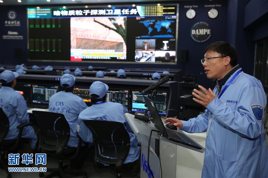 12月24日,暗物质卫星工程首席科学家常进在中科院国家空间科学中心空间科学任务大厅介绍卫星工作情况。当日下午5时55分,我国科学卫星系列首发星——暗物质粒子探测卫星“悟空”在升空后第7天,成功获取首批科学数据并下传至中科院国家空间科学中心空间科学任务大厅。接收到的数据显示,暗物质卫星的四大科学载荷——塑闪阵列探测器、硅阵列探测器、BGO量能器、中子探测器探测到的高能电子和伽马射线计数与此前地面预测计数率一致,表明暗物质卫星的有效载荷已开始正常工作。暗物质卫星有效载荷还要经历2个月的在轨测试和标定,之后正式交付中科院紫金山天文台负责的科学应用系统,进入在轨运行阶段,开始为期2年的巡天观测和1年的定向观测。新华社记者 金立旺 摄
