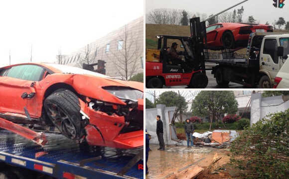 上午9时,一辆叉车正将桔红色兰博基尼事故车从垮塌的围墙中移出来,然后移放在救援车上。事故车右前侧已被撞坏,车牌被有“正能量名车会所”标志的车套挡住。