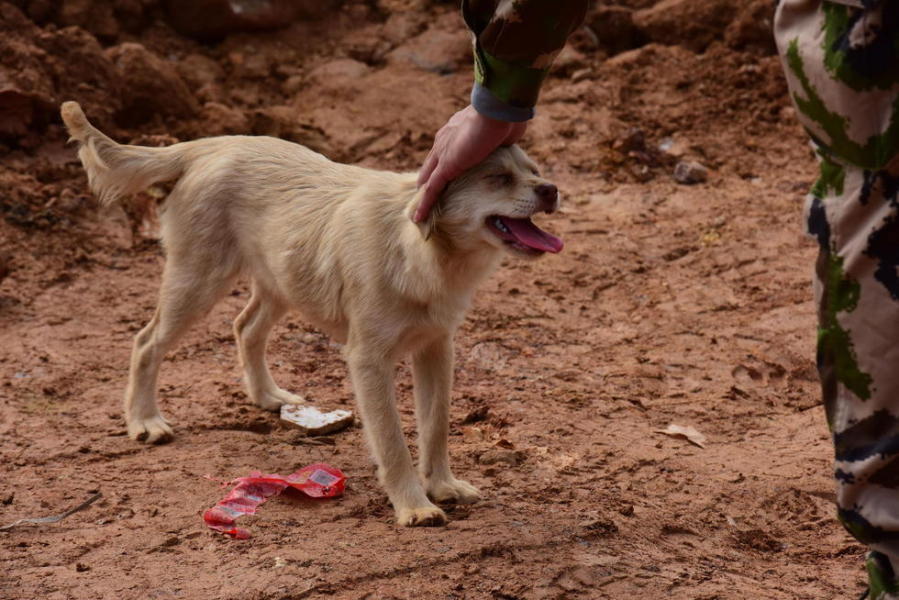 救援人员黄先生称,这是23日该救援队在附近救出的生还犬,救出后,该犬仍然在附近停留打转,像在寻找和等待着主人的出现,一直到当下。