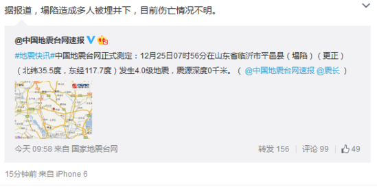 中国地震台网正式测定:12月25日07时56分在山东省临沂市平邑县(塌陷)(更正)(北纬35.5度,东经117.7度)发生4.0级地震,震源深度0千米。