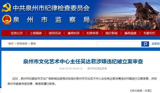 今天上午,中共泉州市纪委、泉州市监察局官方公众平台“刺桐清风”发布消息:近日,泉州市纪委驻市文化广电新闻出版局纪检组对泉州市文化艺术中心主任吴达君涉嫌违纪问题进行立案审查,并经泉州市委宣传部同意,暂停其履行职务。