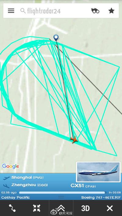 23日一大早,一位每天都会关注郑州机场货航的航空爱好者注意到,用于追踪航班的Flightradar24上的飞机航迹显示,一架航班号为CX51、从上海浦东郑州的波音747-467ERF型货机在郑州机场上一直绕啊绕。