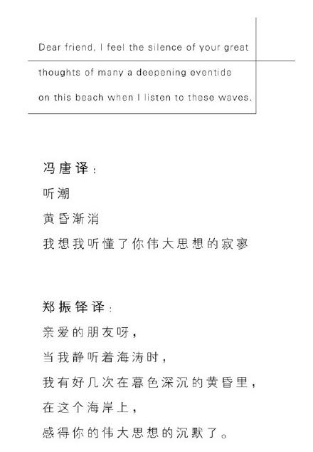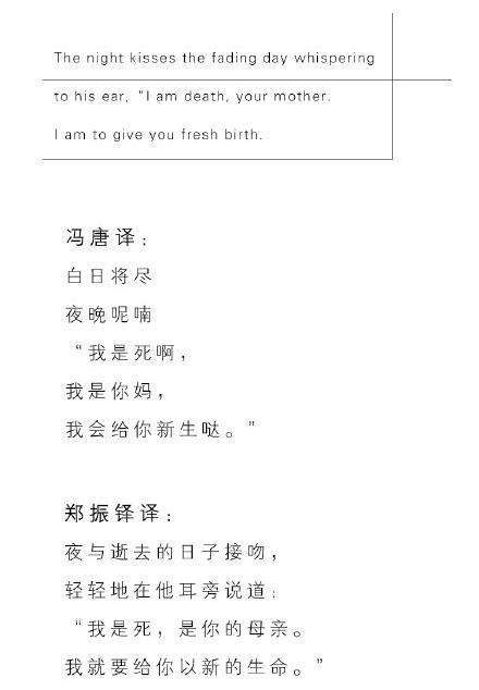 之后,她列举几处翻译,从“这个译本‘信’没有问题,问题出在‘雅’上面”、“用网络用语仅仅为了押韵”、“在诗意上冯译明显比郑译略胜一筹”等方面得出结论:“公里公道讲,冯唐的译本还是不错的,只不过是一个译者个人风格过于强烈的译本罢了。由于公论郑振铎的《飞鸟集》译本是过去国内多个译本中水平最高的译本,冯译既然超过了郑译的水平,所以最合乎逻辑的结论是:冯唐的译本是《飞鸟集》迄今为止最好的中文译本?!?/p>