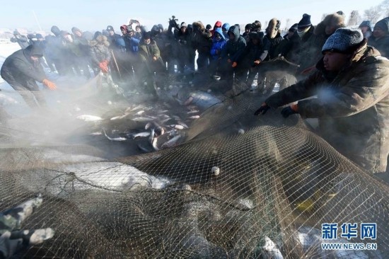 12月27日,在哈尔滨市道里区长岭湖,捕鱼农民从网中捞鱼。新华社记者王建威 摄
