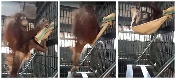 据悉,视频中的猩猩灵活地爬上铁笼壁,将手中毯子一端系在天花板的横杆上,另一端绑到竖杆上,再手脚并用将绳结拉紧,稍作整理后一张吊床就成形了。接着它尝试着躺上去,发现床有些小,便解开毯子重新绑了一次。其动作行云流水,一气呵成,堪称完美。在完成后,内莫还喜不自胜地在自己的杰作面前挪着步子走来走去,似乎也为自己的才智所折服。