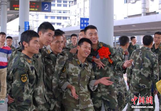 资料图:广西武警退役官兵笑别军营 ?;仆∩恪 ?/p>