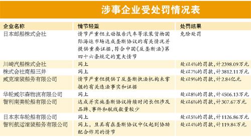 国家发改委12月28日发布公告称,历经一年多的调查,发改委日前对日本邮船株式会社、川崎汽船株式会社、株式会社商船三井、威克滚装船务有限公司、华轮威尔森物流有限公司、智利南美轮船有限公司、日本东车轮船有限公司、智利航运滚装船务有限公司等8家滚装货物国际海运企业达成并实施价格垄断协议的行为依法作出处罚,分别处以2014年度与中国市场相关的滚装货物国际海运服务销售额之4%~9%不等的??睿霞品?睿矗埃芬谠?。