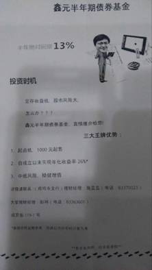 在投资者向记者展示的鑫元半年期债券基金的宣传单页上,记者看到其中多张写有“半年绝对回报 13%”。一款非保本浮动收益型基金产品,宣称是“绝对回报”显然是违规的。