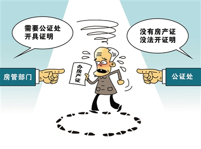 陕西商洛市商州区82岁的吴锋为办房产证,奔波5年。他找过开发商工作人员,却被告知房管部门要求在公证处开具证明,但公证处又说,没有房产证没法开证明。(12月28日《华商报》)