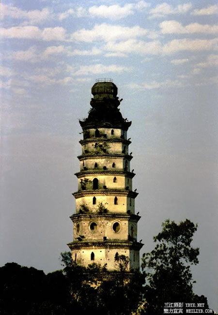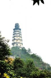 宜宾东山白塔建于明代隆庆年间,屹立在江北的东山上,因塔身呈白色,与南岸七星山对峙。塔身空心密檐六方圆锥形砖。塔心柱在八层以下为四边形,楼梯绕塔心室旋转而上,一直到达塔座,塔内光线充足。石结构,共八层,高35.8米,边长4.45米。