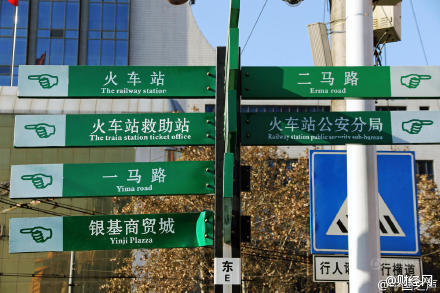 本为“高大上”,如今闹笑话。郑州火车站管委会表示,他们也发现了不少错误,对厂家的英文水平“表示十分不满”,将会回收错误指示牌,并欢迎市民多提意见。图为郑州火车站的交通指示牌。