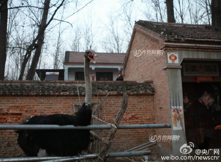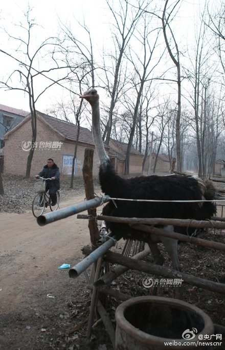 【山东农户羊圈养鸵鸟 村民专程绕道参观】近日,菏泽单县花园行政村一村民家门口异常热闹。原来,这位农户家门口的羊圈里没有养羊,反而圈养了一只鸵鸟,自从这只鸵鸟被主人圈养在羊圈里以后,它就成为这十里八村的“名人”,时常有外乡人专程绕道前来观看。