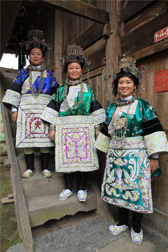 贵州省榕江县乐里镇兴隆侗寨妇女准备参加跳芦笙舞等活动。