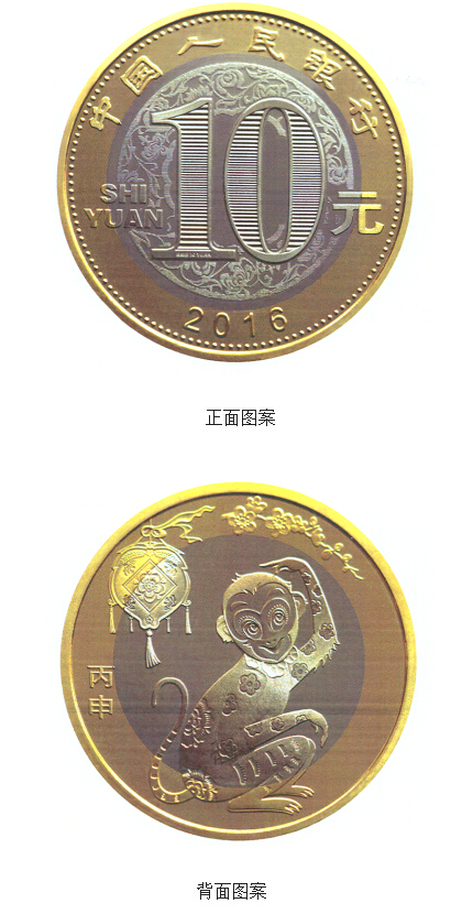 记者在央行官网发布的公告上看到,该普通纪念币正面刊“中国人民银行”、“10元”、汉语拼音字母“SHIYUAN”及年号“2016”,底纹衬以团花图案。背面主景图案为一只传统装饰造型的猴子,抬手远眺;其上方为桃形花灯和梅花图案,币面左侧刊“丙申”字样。