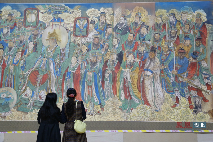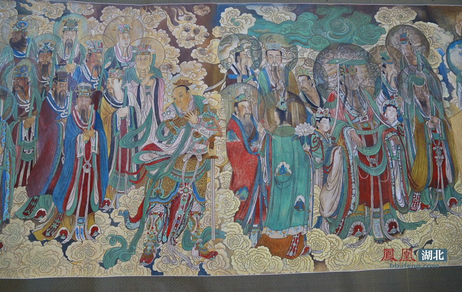 “我临摹完成的作品重达500多公斤,展开后可铺满一个足球场。这件作品共展出3次,因为太大,每次都不能全部展出,这次来武汉的是《朝元图》彩色稿和《纯阳帝君神游显化图》、《四大天王》?!绷跤怪?。