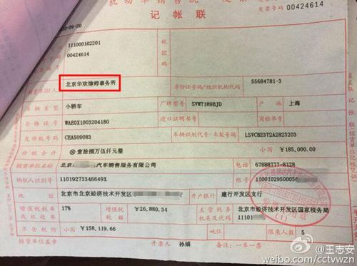 | 王志安公布的购车发票,购货单位为北京华欢律师事务所?!?/td> |