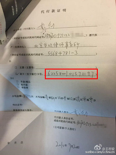 文中一张2010年9月20日的机动车销售发票显示,北京市华欢律师事务所从北京一家4S店购买一辆大众斯柯达轿车,刷卡记录单上的卡号和手写签名指向刷卡人为彭剑。王志安指出,这笔179392元的购车款来源于网友捐赠的安保资金,而据仍能查到的安保资金募集公告,以彭剑为户名的尾号1197北京招行一卡通账户(下简称“1197账户”)恰恰是其在网上公布的资金募集账户。另一份代付款证明可见,是由彭剑替北京华欢律师事务所付购车款,王志安称,此举绕开公务账户管理规定,使得“网友们捐助给安保资金的善款,摇身一变成了彭剑为自己律所买车的赃款”。