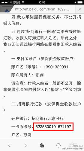 | 安保资金募集公告显示,以彭剑为户名的尾号1197北京招行一卡通账户恰恰是其在网上公布的资金募集账户。 |