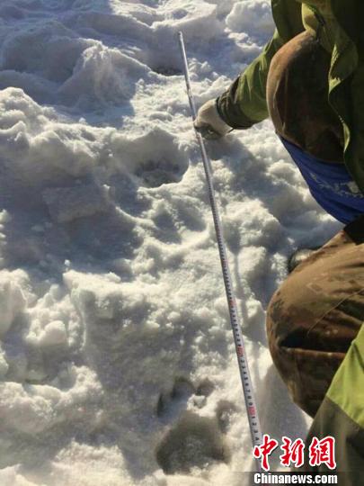 工作人员测量雪地上留下的足迹 林业部门供图 摄