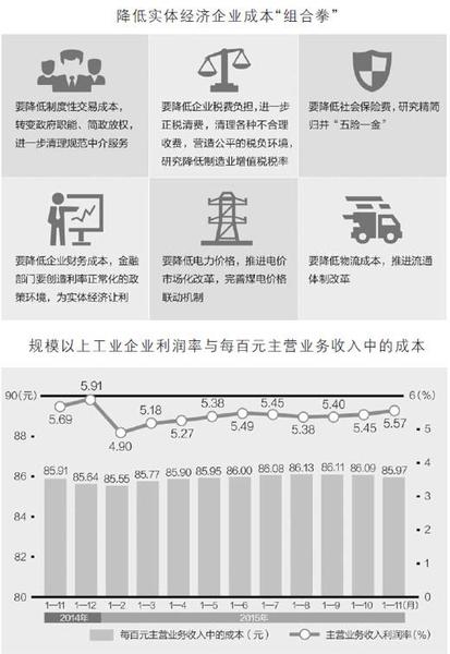 企业可盈利,有活力,经济才能有持久的发展动力。国家统计局发布的数据显示,规模以上工业企业每百元主营业务收入中的成本,2012年以来一直维持在85元左右的高位,2015年1—11月为85.97元,同期企业利润率仅为5.57%。现实中,很多企业反映成本高,日子难过。