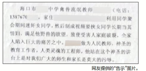 近日,有网友向南国都市报新媒体报料平台报料称,有人在海口某中学门口张贴一张告示称,该校一名朱姓男教师,利用同学聚会迷奸女同学,导致其家庭破裂。3日,南国都市报记者和该朱姓教师取得联系,该教师对此予以否认,并称这是有人在制造谣言想败坏他的名声,但该教师并未表态是否已报警,并称自己也知道是谁张贴的。