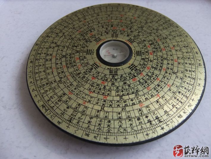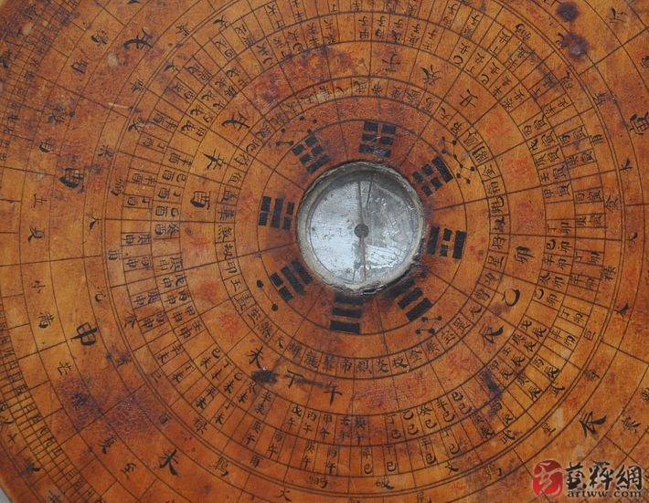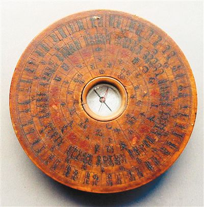罗盘由三大部分构成,即天池、内盘和外盘。天池即罗盘最中央的指南针,可以指示方向,给罗盘定位;内盘是紧贴着指南针那一层可以 转动的圆盘,内盘上印有好多圆圈,每一个圆圈叫作一层,有的罗盘层多,有的层少,每一层都是古代中国人对自然的一种理解,也从一个侧面反映了罗盘的复杂程 度;外盘是正方形的内盘托盘,在四边外侧中点各有一个小孔,穿入红线,称为“天心十道”,可以用来读取内盘上的内容。笔者收藏的这只罗盘上有九层,分别有 八卦、五行、天干、地支、二十四节气、二十八星宿、六十四易卦以及一百二十八分金等内容。不过,这只罗盘只有天池和内盘,外盘已无处可寻。(吕冠兰)