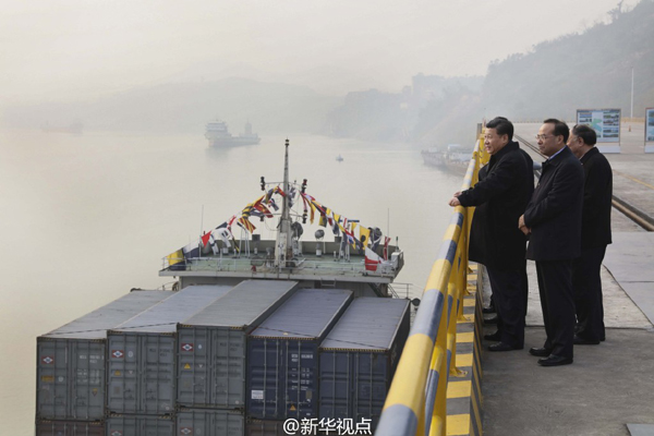 新华网北京1月5日电 习近平总书记4日下午来到重庆果园港考察,听取长江上游航运中心建设、铁路公路水路联运等情况介绍,察看正在作业的集装箱船。听说渝新欧国际铁路沿线国家实现一次报关查验、全线放行,他赞赏“挺好”??吹礁劭谏枋┢氡福殉蹙吖婺?,他说:“这里大有希望?!?br/>