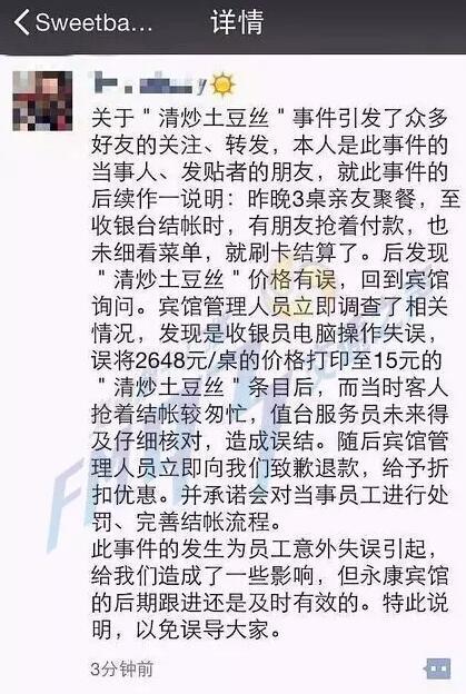 永康一宾馆现天价土豆丝1盘2648元 称操作失误