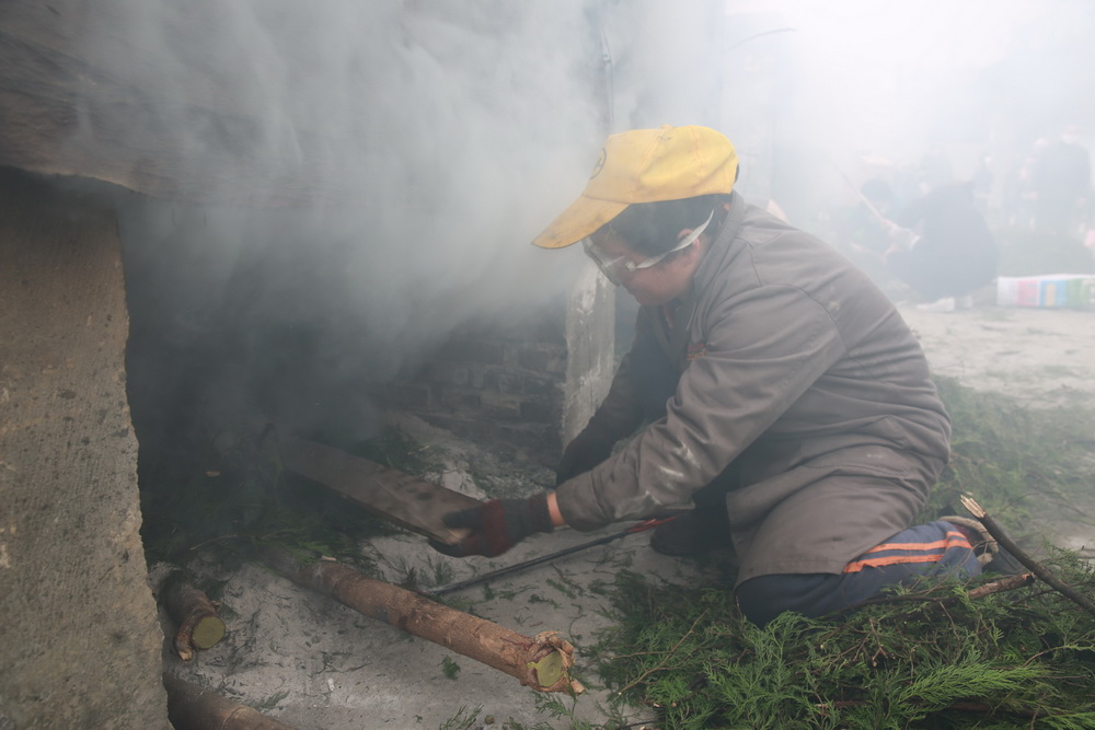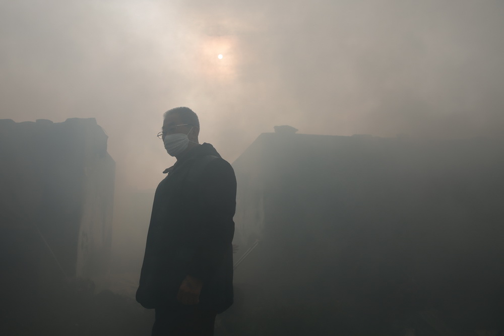 2016年1月5日,达州市民扎堆在五里店熏制点熏腊肉,市民“全副武装”用上了浅水镜、口罩、围巾等物品。张骥/视觉中国