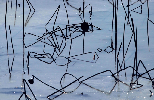 这是1月5日在天津蓟县于桥水库北岸的月亮岛湿地拍摄的残荷??菸暮苫ㄒ侗颂饕欤路鸹乙运嫖脊蠢粘龅某橄笙咛趸?。