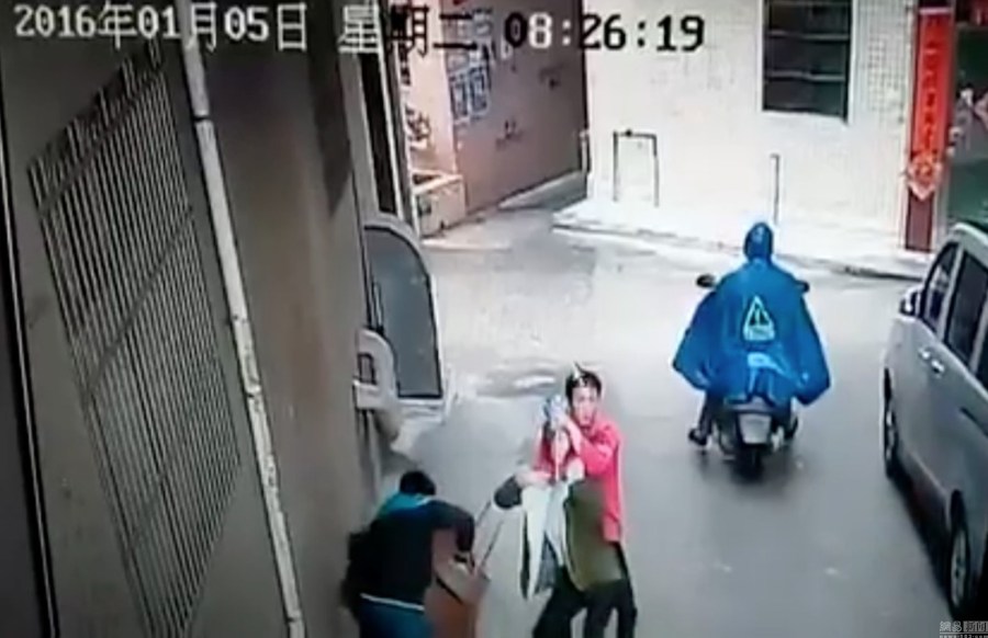 约57秒,一名红衣男子先朝路口走去,撑着先前的蓝色雨伞。一名蓝衣男子尾随其后,边走还边撑雨伞。26分,一名挎包女子出现在路口,红衣男子折回跟在女子后面,后面的蓝衣男子撑伞掩护在后面,红衣男子从身后扼住女子的颈部,并往路口拖拽,此时先前的摩托车也开了出来,开车的依然是穿蓝色雨衣的男子,朝路口右边的巷子驶离出监控区域。(视频翻拍)陈奕启