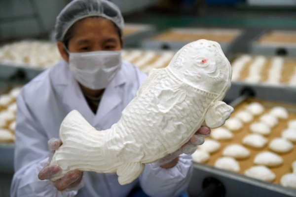 1月6日,河北省黄骅市一家面花生产企业工作人员展示刚刚出笼的鱼造型的面花,寓意“年年有鱼”。新华社发(傅新春 摄)