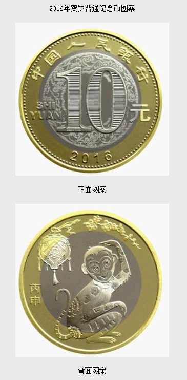 这次的纪念币面额为10元,直径27毫米,双色铜合金材质。在纪念币正面有“中国人民银行”、“10元”、汉语拼音字母“SHIYUAN”及年号“2016”,背面为一只传统装饰造型的猴子,抬手远眺,猴子的上方是桃形花灯和梅花图案,左侧有“丙申”字样。
