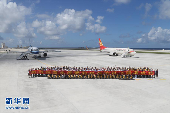 1月6日,两架民航客机降落南沙永暑礁新建机场。这是相关人员合影留念。当日,中国政府征用的两架民航客机先后从??诿览蓟∑鸱?,经过近2小时的飞行于10时21分、10时46分平稳降落南沙永暑礁新建机场并于当日下午返回???,试飞成功。永暑礁新建机场位于我国南沙永暑礁上,是我国目前最南端的一座机场。