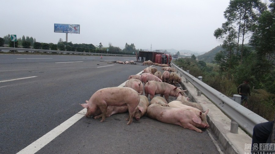 据货车驾驶员称,他拉着66头生猪从合浦前往南宁,行至事故路段时,车轮上的螺丝钉突然断了,车轮飞了出去,之后车辆就发生了侧翻。事故中生猪死了4头、跑了3头,经济损失估计有几万元。图为现场。