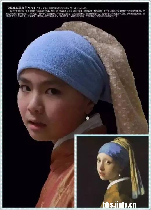 三年级男生陈笑石模仿《戴珍珠耳环的少女》,他眼睛大、睫毛长,和画中少女有些神似。妈妈的围巾绑在头上,耳环戴上;没有白领子,小家伙急中生智,塞进一张餐巾纸,搞定。他说自己模仿好的秘诀是,做了个发呆的表情。