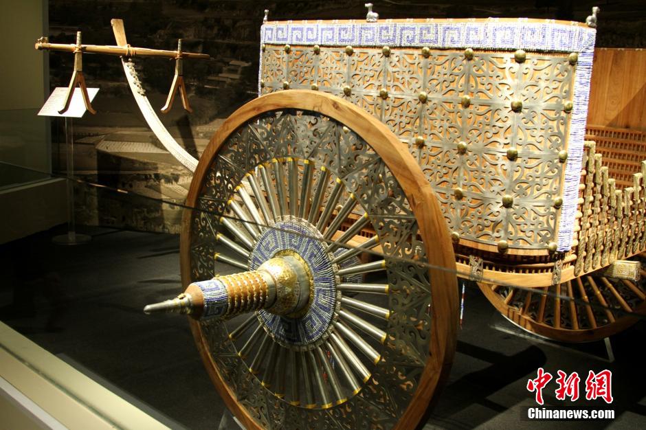 1月7日,《帝国之路·陇东记忆:秦文化与西戎文化考古成果展》在西安临潼秦始皇帝陵博物院开展。随着电视剧《芈月传》的热播,义渠等古代西戎支系逐渐为人所熟知。包括西戎义渠“豪车”、秦公大墓铭文镈钟在内的128组300多件文物珍品亮相,揭开了秦文化与西戎文化的神秘面纱。其中一辆耗资200万元复原的“古代豪车”格外引人注目。 田进 摄