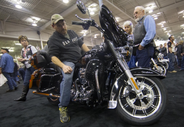 1月9日,在加拿大多伦多,一名参观者在摩托车展中观看一辆哈雷摩托车。