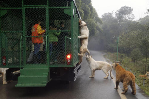 关键词:狮子老虎爬车抢食