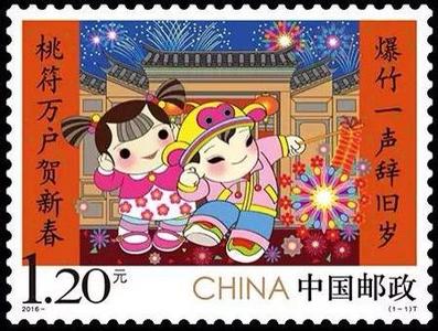 1月10日,中国邮政发行《拜年》特种邮票1套1枚,邮票面值为1.2元。这是中国邮政再次发行以“拜年”为主题的邮票?!栋菽辍酚势被嬉浴盎痘丁⑾蚕病绷礁隹ㄍㄐ蜗笪饕?,“欢欢”戴着“猴帽”左手高举竹竿,竹竿上挂着火红的正在燃放的鞭炮,炮花如绽放的春之花,绚丽多彩;“喜喜”双手捂耳,一脸喜悦,笑逐颜开。两侧吉祥如意的对联:“爆竹声声辞旧岁,桃符户户贺新春”,由我国著名书法家欧阳中石所题。