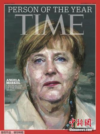 资料图:2015年12月9日,美国《时代》周刊宣布2015年度风云人物为德国总理默克尔,赞扬她在欧洲主权债、难民和移民及俄罗斯干预乌克兰等?;诩渌瓜值牧斓寄芰Α?