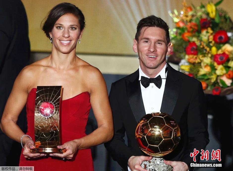 图为梅西和劳埃德获奖,美国女足队长劳埃德荣获2015年世界足球小姐。