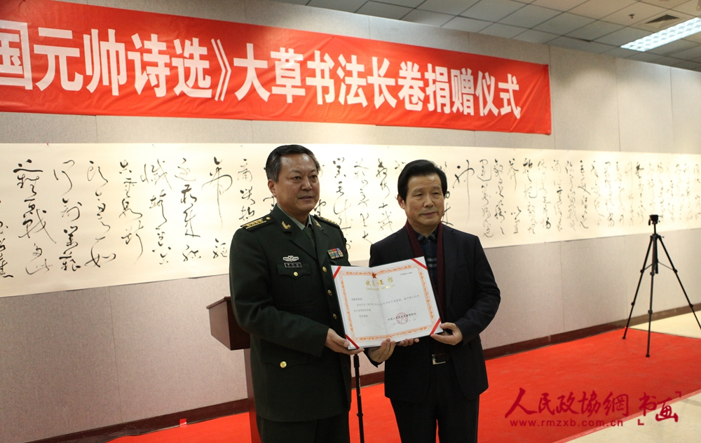 1月11日,全国政协委员、中国书法家协会顾问、当代草书大家言恭达向中国人民革命军事博物馆捐赠大草书法长卷《新中国元帅诗选》。军事博物馆副馆长马琳杰接受捐赠,并向言恭达颁发收藏证书。