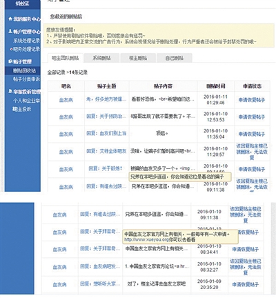 血友病贴吧删帖截图。受访人供图