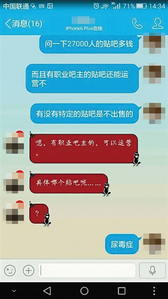 一要求匿名的吧友提供了数张对话截图显示,他曾向某代理问价“尿毒症吧”的吧主价格,对方回应称有职业吧主的贴吧也可以运营,但此类病种吧,需要由申请人给出对这个贴吧的预算报价,由他们来上报,最后对该贴吧定出最低价,并进行公开竞价,“哪家公司出价高,哪边获得?!?/p>
