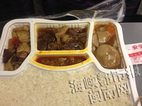 在厦门北站,海都记者在出站口见到马先生一家3口。他告诉记者,他们是从南京来到厦门。昨天中午12点多,餐车第二次推到他们面前时,他喊住了乘务员。盒饭只有牛肉(53元/份)和猪肉(48元/份)两种。马先生点了一份猪肉套餐。