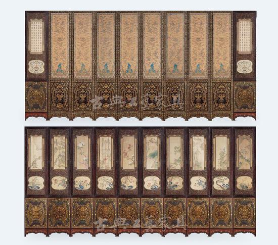 此屏风采用木雕、缂丝画、描金彩漆、宫廷画四种工艺制作而成,是极为难得的清宫旧藏之宝。工艺上匠心独运,力求精细,使整个屏风显得通透而美观。