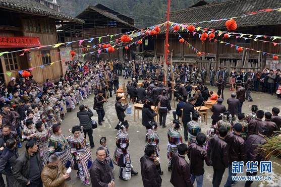 1月10日,在榕江县扒王侗寨,人们穿着盛装踩歌堂,迎接侗族新年。当日是贵州省榕江县扒王侗寨侗族大年初一,当地侗族同胞伴随着侗族歌师弹奏的琵琶歌,欢乐踩歌堂,迎接侗族新年的到来。“踩歌堂”是侗族祭祀神灵,祈求人畜兴旺、五谷丰收的盛大集体活动。新华社发(王炳真 摄)