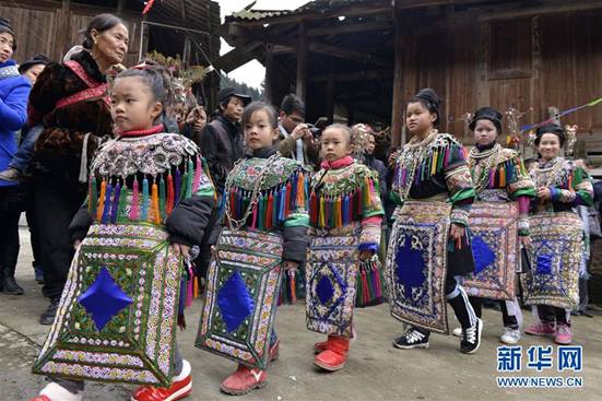 1月10日,榕江县扒王侗寨里的侗族女孩穿着盛装踩歌堂迎接新年。当日是贵州省榕江县扒王侗寨侗族大年初一,当地侗族同胞伴随着侗族歌师弹奏的琵琶歌,欢乐踩歌堂,迎接侗族新年的到来?!安雀杼谩笔嵌弊寮漓肷窳?,祈求人畜兴旺、五谷丰收的盛大集体活动。新华社发(王炳真 摄)