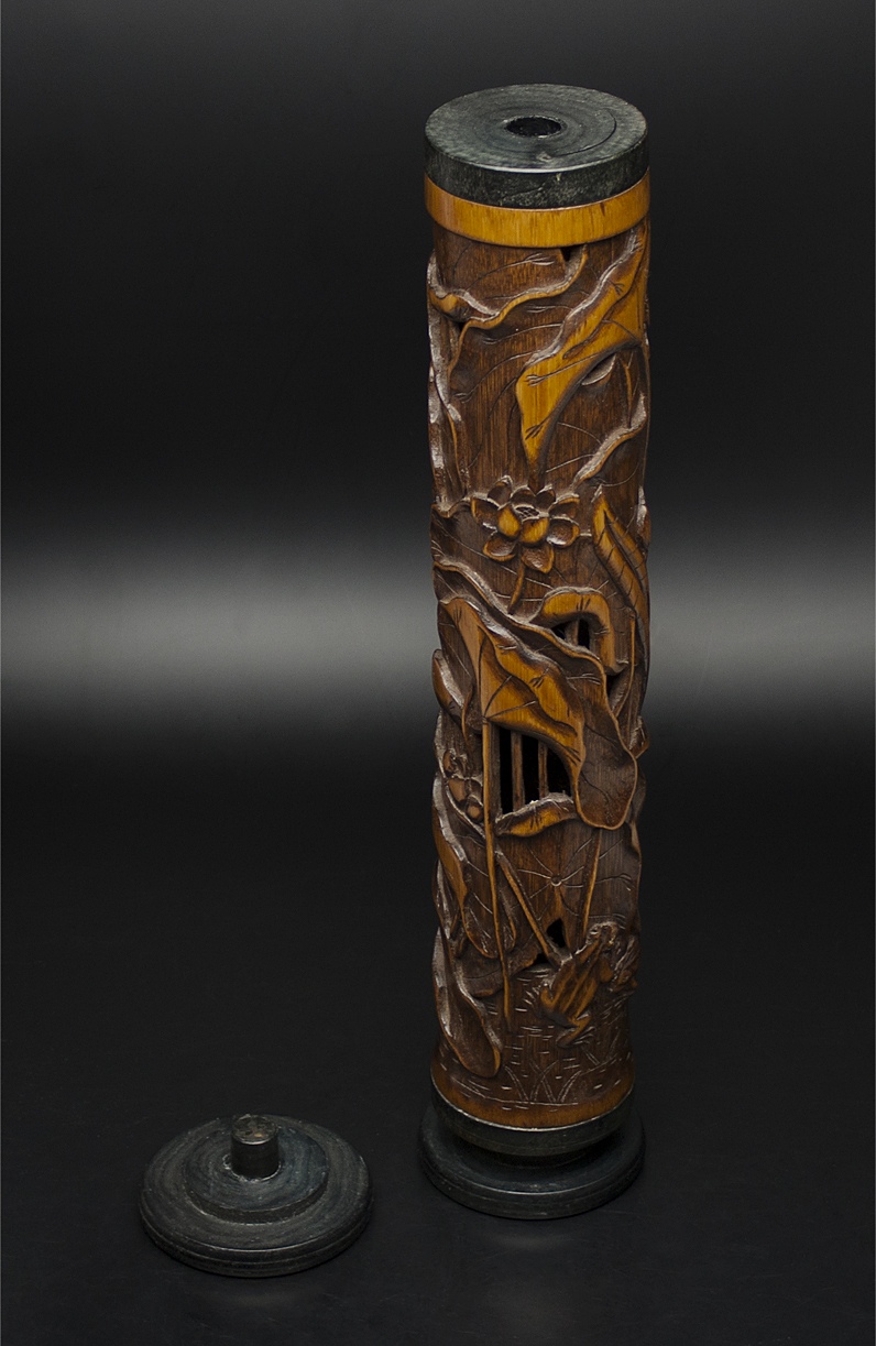 香筒大多镂刻图纹,明末书画家文正亨《长物志》记有:“香筒旧者有李文甫所制,中雕花鸟,竹石,略以古筒为贵,若太涉脂粉便称俗品,亦不必置怀袖中。”从中可知文人所用香筒风尚,追崇简明、清雅。